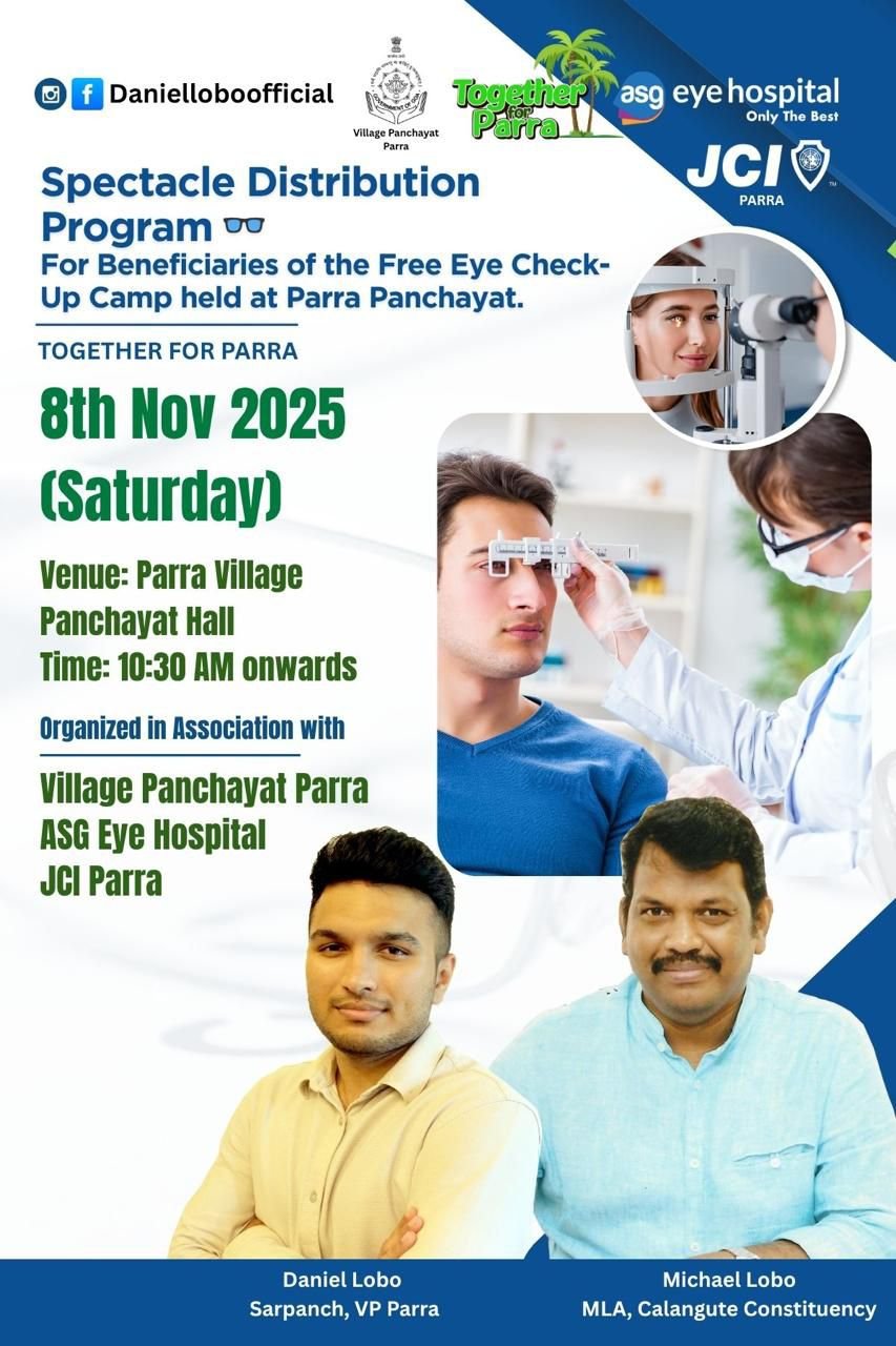 Parra, November 8, 2025: The Village Panchayat Parra, in collaboration with ASG Eye Hospital and JCI Parra, successfully distributed free spectacles to beneficiaries of the recent Free Eye Check-Up Camp, marking a significant milestone in the “Together for Parra” initiative.