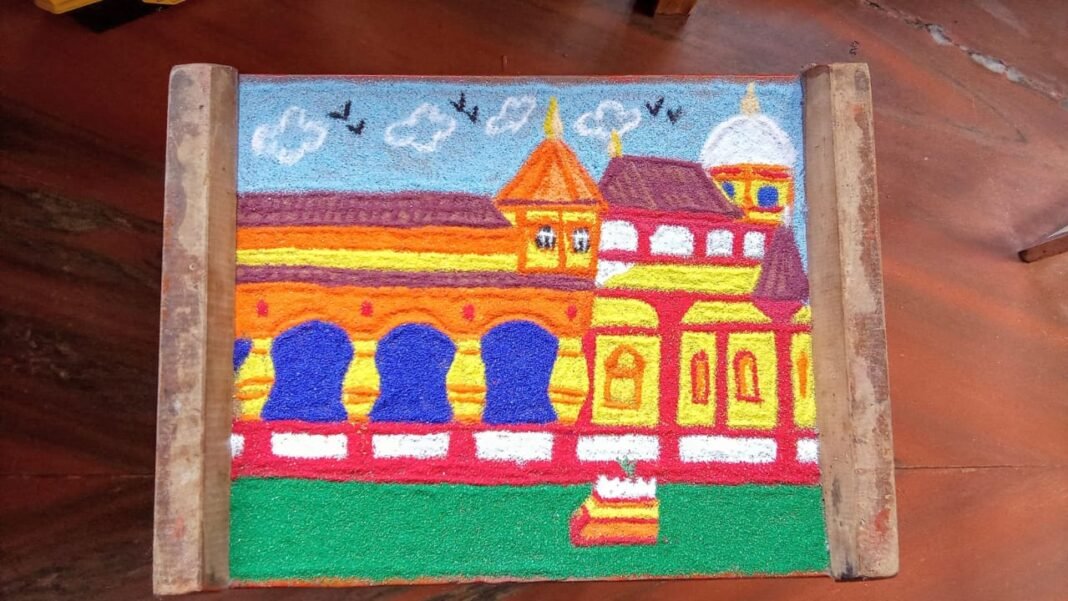 “Amona’s Artistic Gem: Shri Soma Ramnath Sinari’s Exquisite Rangoli Adorns Wooden Block”