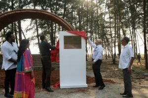 photo captions (L-R); Architect Vinu Daniel, along with CCP Mayor Rohit Monserrate, Sandip Jacques (IAS), Managing Director & CEO, Imagine Panaji Smart City Development Ltd and Smriti Rajgarhia (Extreme right), Director, Serendipity Arts Foundation & Festival during unveilment of his latest installation – To Terra Grove at Miramar beach as part of the Serendipity Arts Festival 2025.