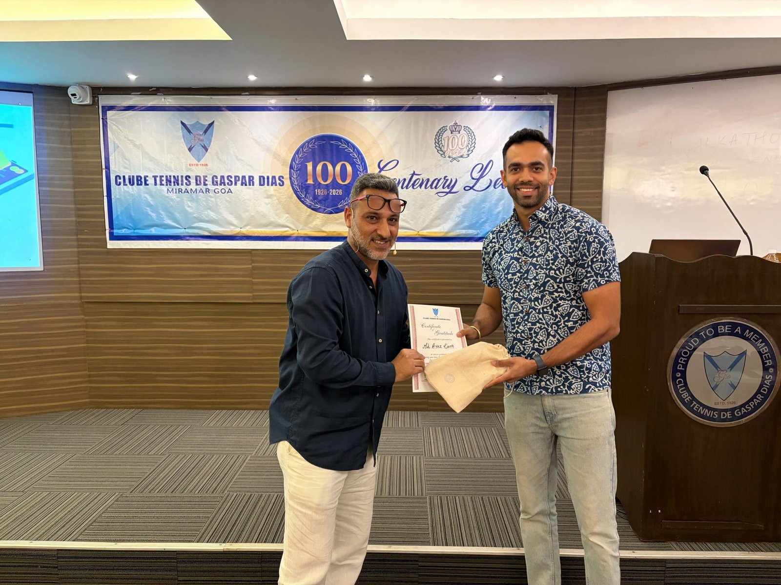 photo captions: Chairman of the Clube Tennis de Gaspar Dias’ sports committee Sairaj Dhond [right] offering a token of appreciation to cybersecurity expert Mir Ayaz Kanth [left], who conducted a session on cyber-attacks and online scams for senior citizens on the occasion of the iconic club’s centenary year celebrations.