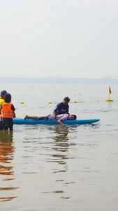 Image 1- Drishti Marine lifesavers conduct a Sagar Safar safety briefing for visitors, guiding them through essential precautions before entering the water. With participants gathered on the shore in their safety gear, the team explains sea conditions, equipment use, and basic open-water safety cues. The initiative reinforces Drishti Marine’s mission to build ocean confidence and promote responsible beach behaviour among visitors.