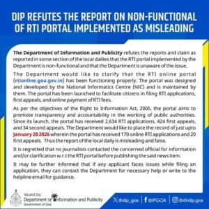 The Department would like to clarify that the RTI online portal (rtionline.goa.gov.in) has been functioning properly. The portal was designed and developed by the National Informatics Centre (NIC) and is maintained by them. The portal has been launched to facilitate citizens in filing RTI applications, first appeals, and online payment of RTI fees.