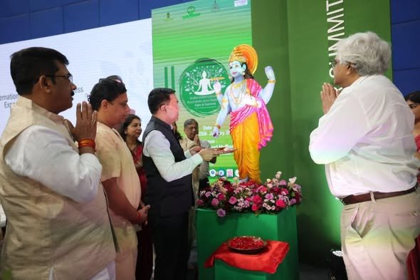 besides chief minister also present werer  Rajya Sabha MP Shri Sadanand Shet Tanavade, Chief Secretary, Dr. V. Candavelou, IAS, M.D. of Patanjali Ayurved Ltd, Acharya Balkrishna, AIIA Director Dr. P. K. Prajapati, and senior doctors, researchers, and wellness leaders.