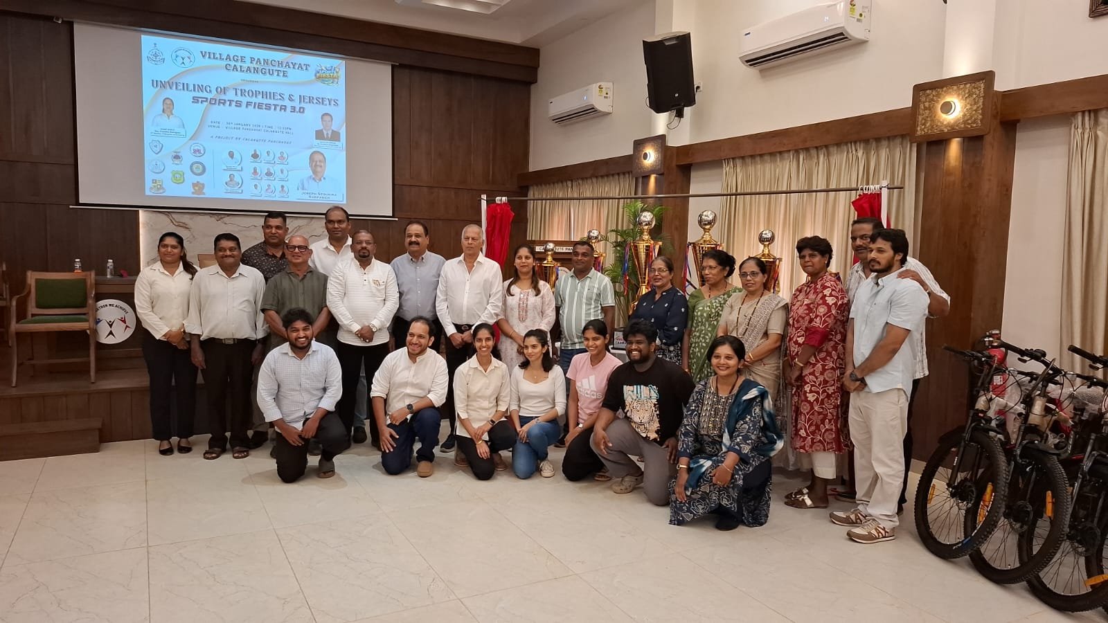 The Village Panchayat of Calangute successfully held the unveiling ceremony of trophies and jerseys for Sports Fiesta 3.0 on Thursday, January 30, 2026, at the Village Panchayat Calangute Hall. The event was graced by Mrs. Franzilia Rodrigues, Zilla Panchayat Member of the Calangute Constituency, as the Chief Guest, and renowned businessman and proprietor of Fat Fish, Mr. Prashant Korgaonkar, as the Guest of Honour.