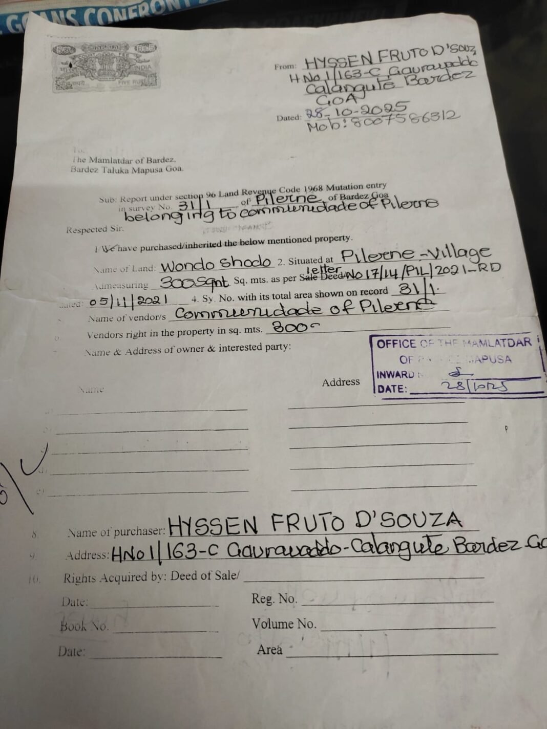 Mapusa : The plight of Pilerne’s Comunidade Gaonkars, especially senior citizens, has come to light due to bureaucratic delays in the mutation process at the North Goa Mamlatdar Office. Mutation, the process of updating revenue records to reflect changes in ownership or title, is crucial for establishing rights over Comunidade lands.
