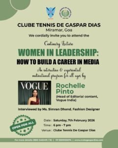 Panaji, February 2026 – A centenary lecture on Women in Leadership: How to Build a Career in Media will be held at Clube Tennis de Gaspar Dias, featuring Rochelle Pinto, head of editorial content at Vogue India, in conversation with fashion designer Simran Dhond. The interactive session will focus on career pathways, leadership, and real-world experiences in media and the creative industries.