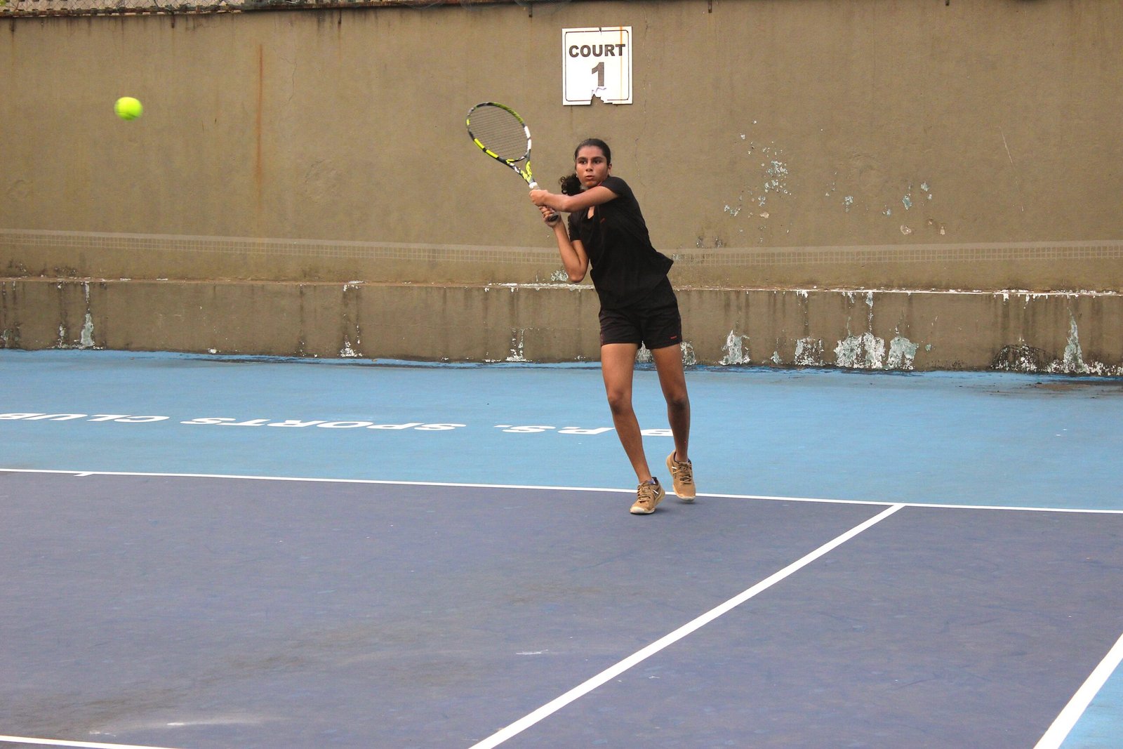 Caption: A woman tennis player plays a shot from the baseline during a previous edition of the Baale BPS Open at the B.P.S Sports Club in Margao.