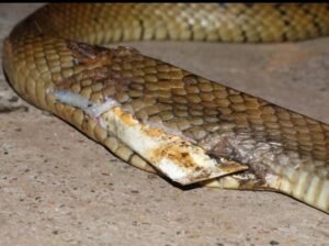 Image 1: A sharp piece of litter that has cut through the insides of a rat snake.
