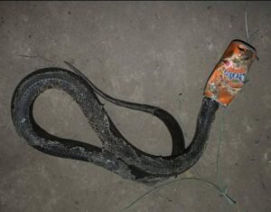 Image 2: A rescued cobra whose head is trapped in a discarded beverage can.