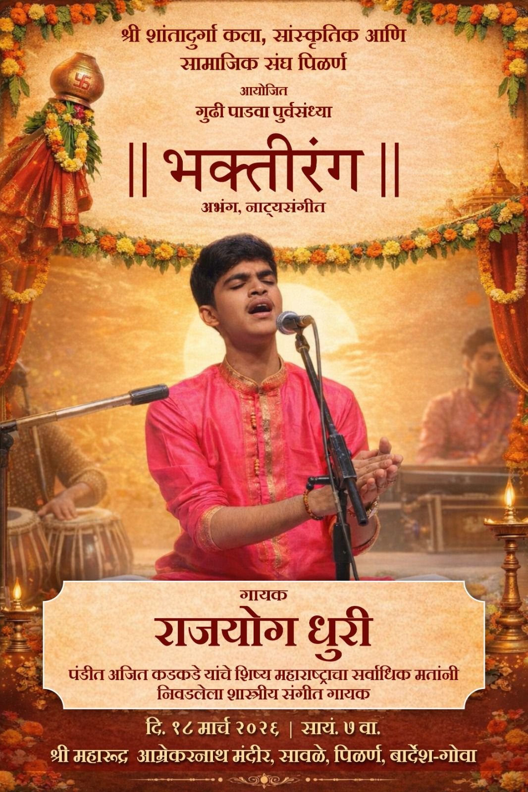 saligao : On the auspicious occasion of Gudi Padwa, Shree Shantadurga Kala, Sanskrutik ani Samajik Sangh, Pilerne will organise a devotional musical programme titled “Bhaktirang – Abhang ani Natya Sangeet” on 18th March 2026 at 7:00 PM at Shree Maharudra Amrekarnath Devasthan, Savlem–Pilerne, Bardez Goa.