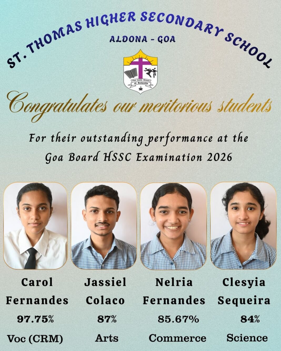 St. Thomas Higher Secondary School Aldona proudly announces its excellent performance in the Higher Secondary School Certificate (HSSC) Examination 2026, conducted by the Goa Board of Secondary and Higher Secondary Education.