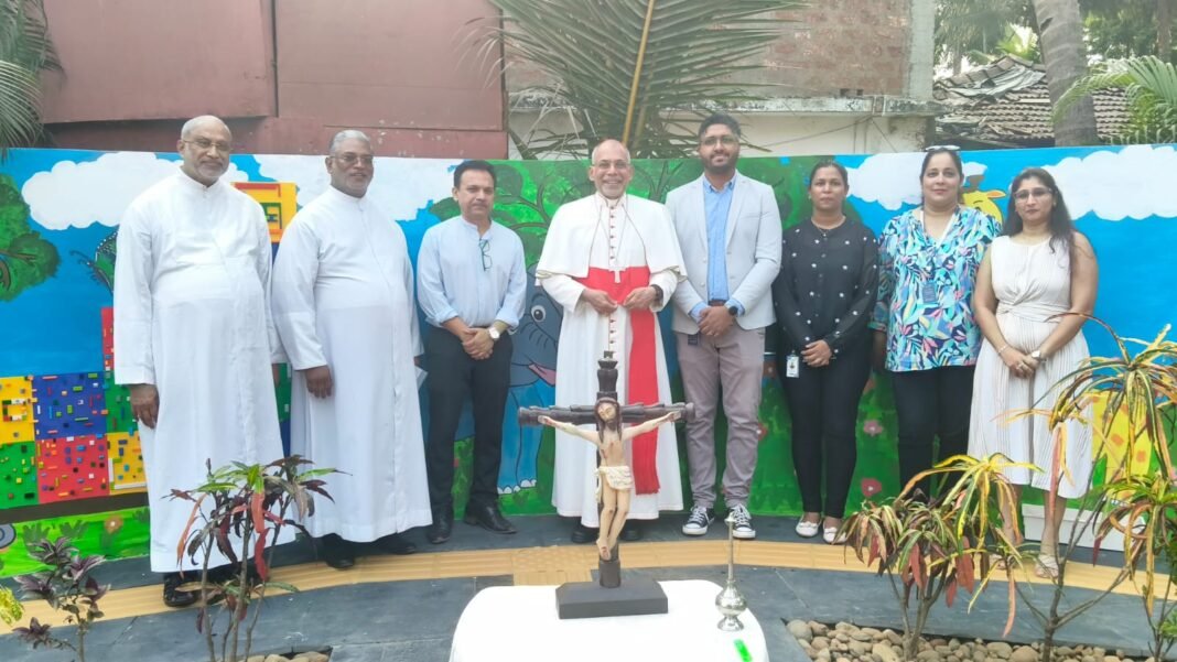 His Eminence Cardinal Filipe Neri Ferrão did the honours of cutting of the ribbon at the entrance of the sensory garden along with Mr. Joshua Silveira, Director – India Operations, Frontline Managed Services, Fr. Maverick Fernandes, Director, Caritas Goa, Fr. Savio Fernandes – Asst. Director of Caritas Goa and others.