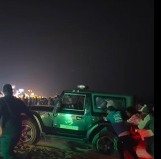 Calangute In a bizarre incident, a Goa Police Thar SUV got bogged down in the sand at Baga Beach, leaving officers scrambling for help. The unexpected twist? Tourists stepped in to save the day, with one enthusiastic helper even taking the driver’s seat to lend a hand. With a combined effort, the vehicle was eventually freed, showcasing an unusual display of public camaraderie.